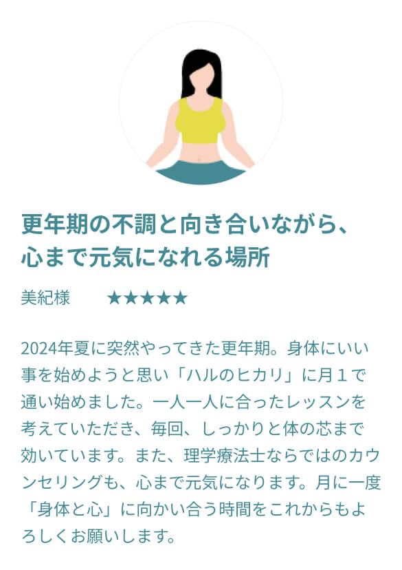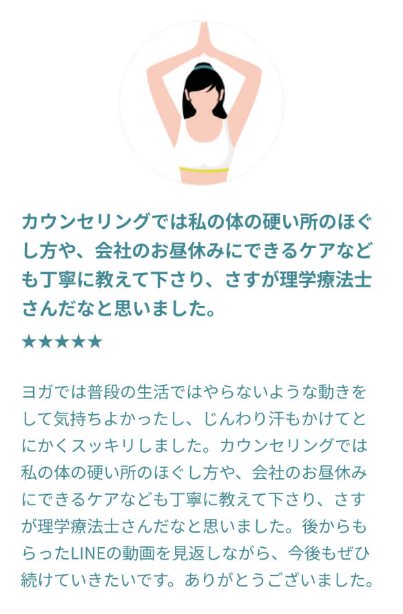 A.理学療法士として多くのリハビリに携わってきた経験から、既往歴や現在のお体の状態(膝痛、腰痛、更年期に伴う不調など)を考慮した安全なプログラムを設計します。不安な方は、事前に公式LINEよりお気軽にご相談ください。