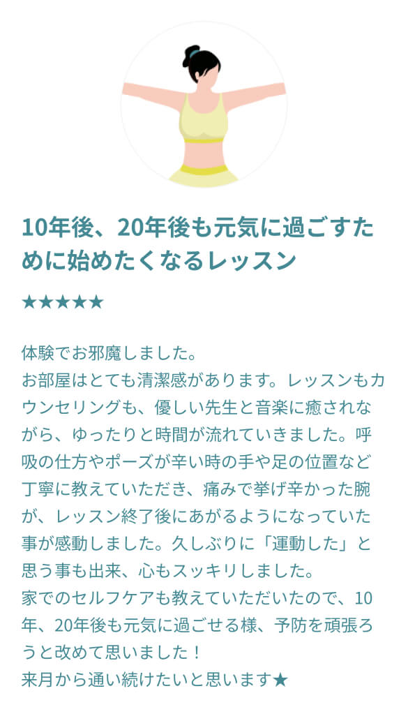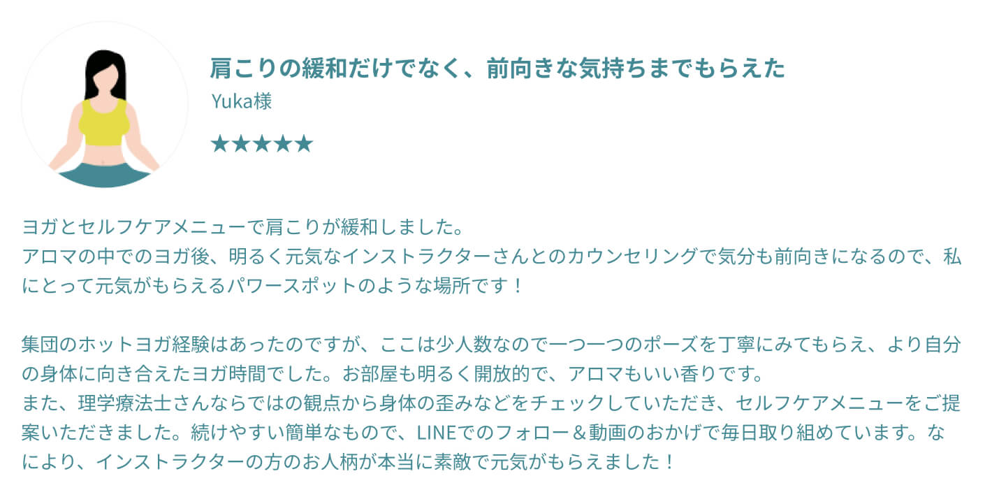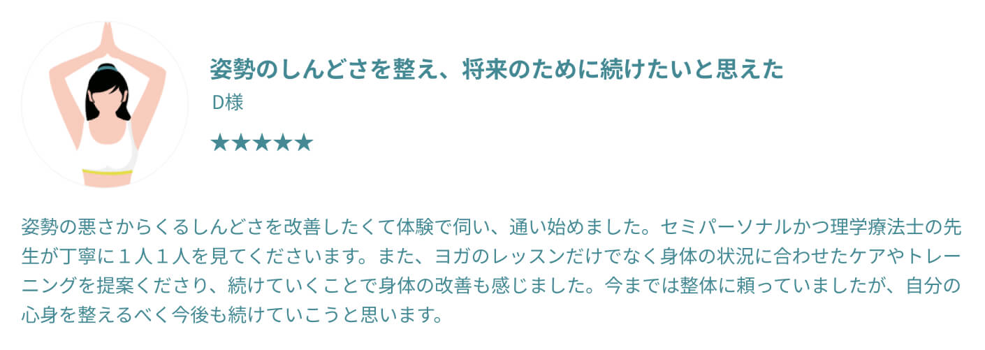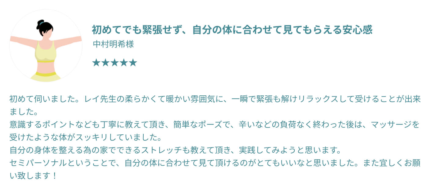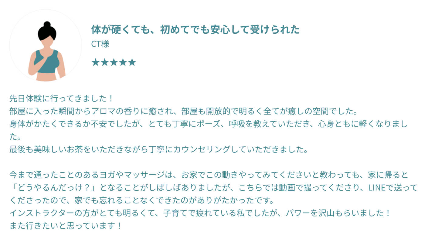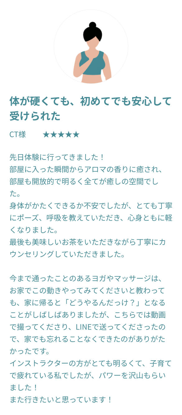 むしろ体が硬い方ほど、整っていく過程でご自身の変化をより鮮明に感じていただけるはずです。 他のスタジオでは不安だった方も、過去の自分との嬉しい変化を楽しみながら、安心してお越しください。