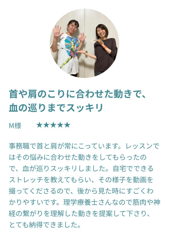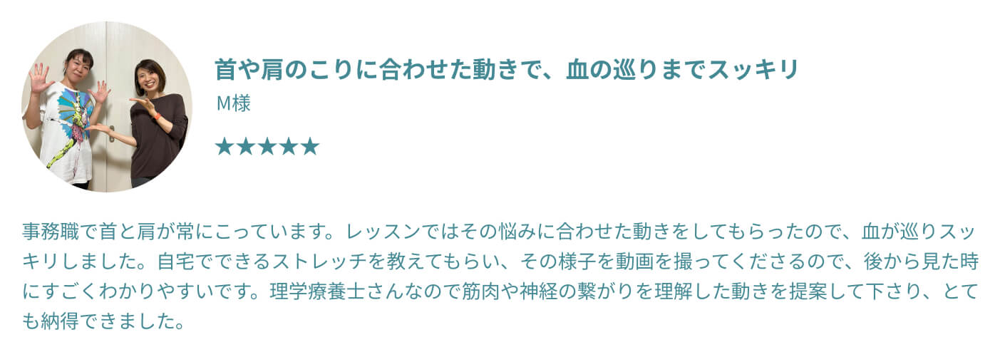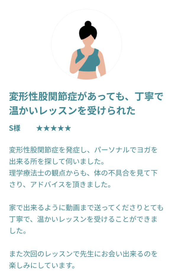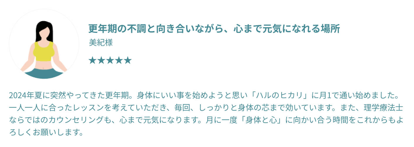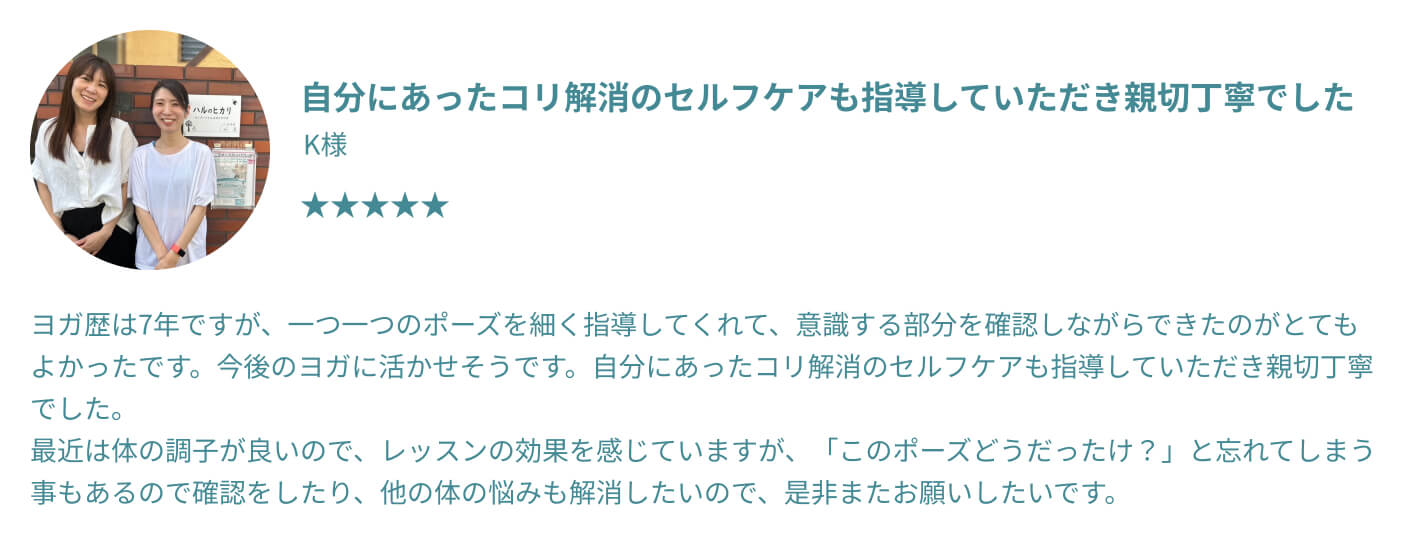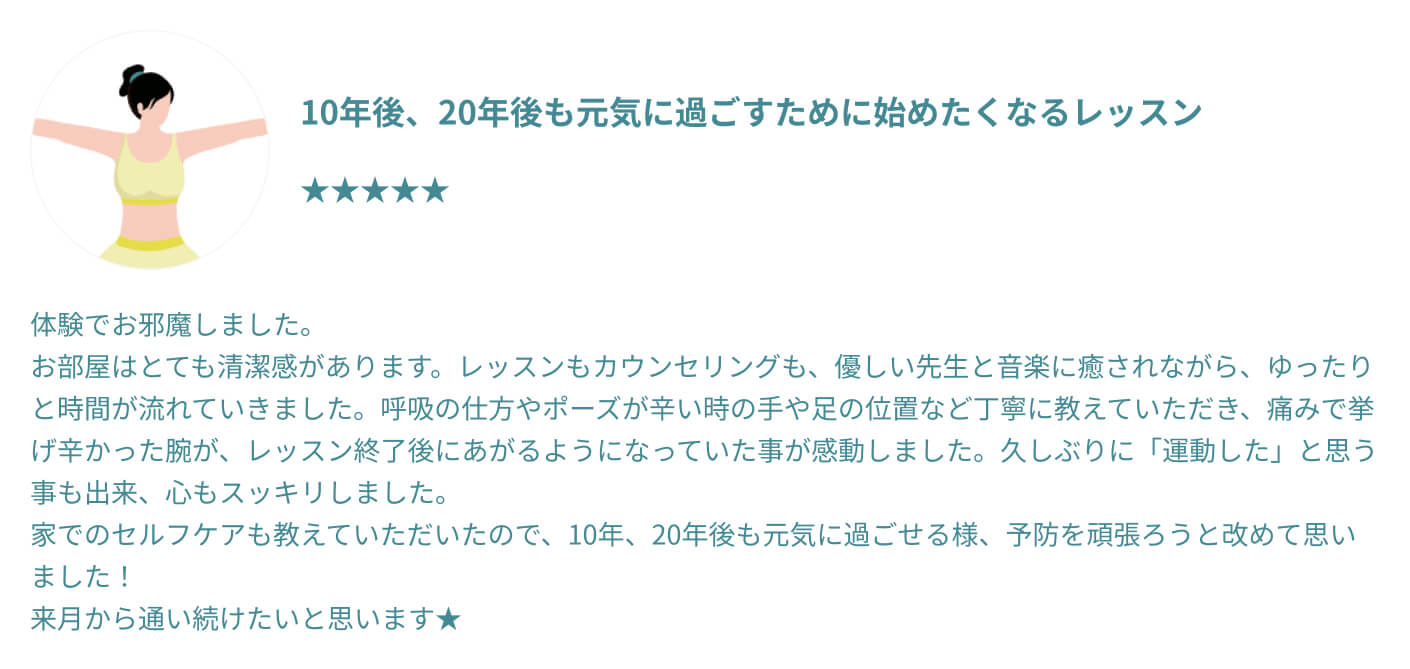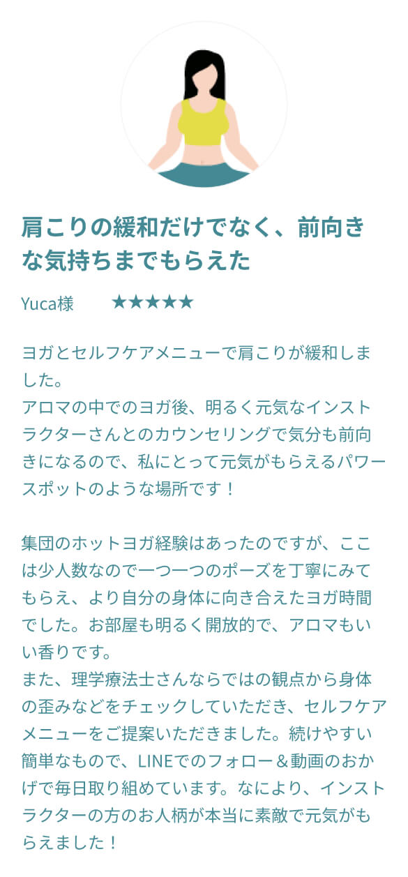 むしろ体が硬い方ほど、整っていく過程でご自身の変化をより鮮明に感じていただけるはずです。 他のスタジオでは不安だった方も、過去の自分との嬉しい変化を楽しみながら、安心してお越しください。